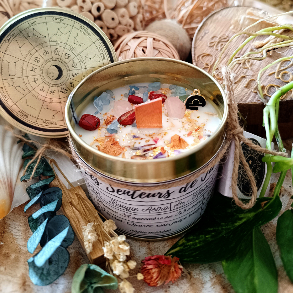 Création 100 % vegan cire de soja, parfums de Grasse et pierres de naissance en harmonie avec la puissance énergétique des signes astrologiques.