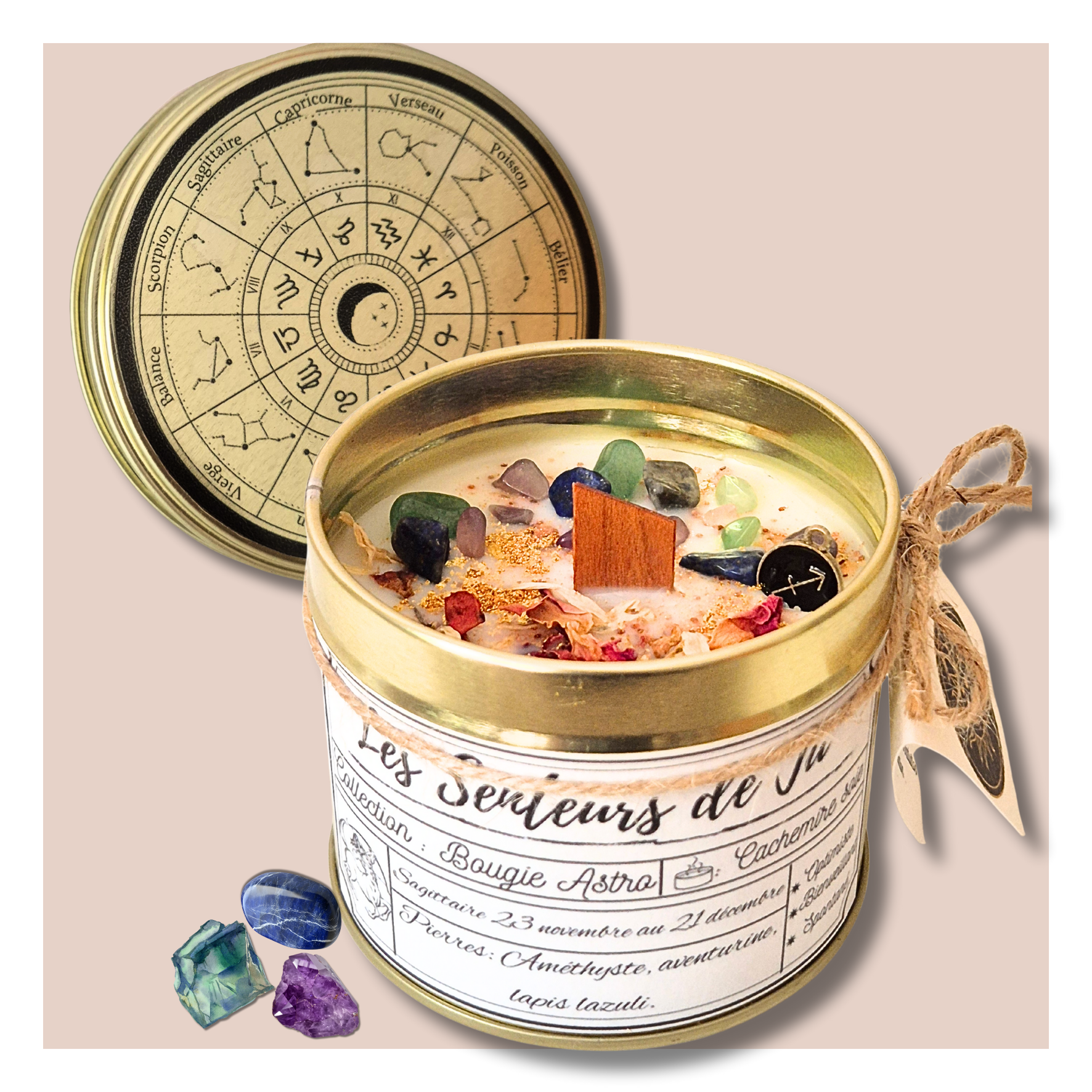 Chaque bougie renferme trois pierres soigneusement sélectionnées pour amplifier vos intentions et diffuser leurs vibrations dans votre environnement :
